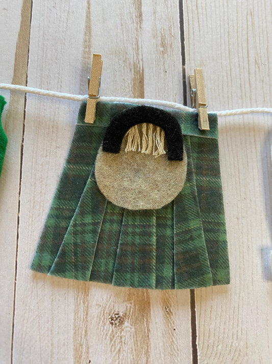 Scottish Bagpiper’s Clothesline Banner, Irish Kilt Miniature Felt Garland, Wall Hanging Decoration for St. Patrick’s Day