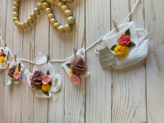 Tea Set Banner, Felt Flower Teapot Garland, with Sugar Bowl & Pitcher, Tea cups with saucers, Wall Hanging Decoration for Mother’s Day