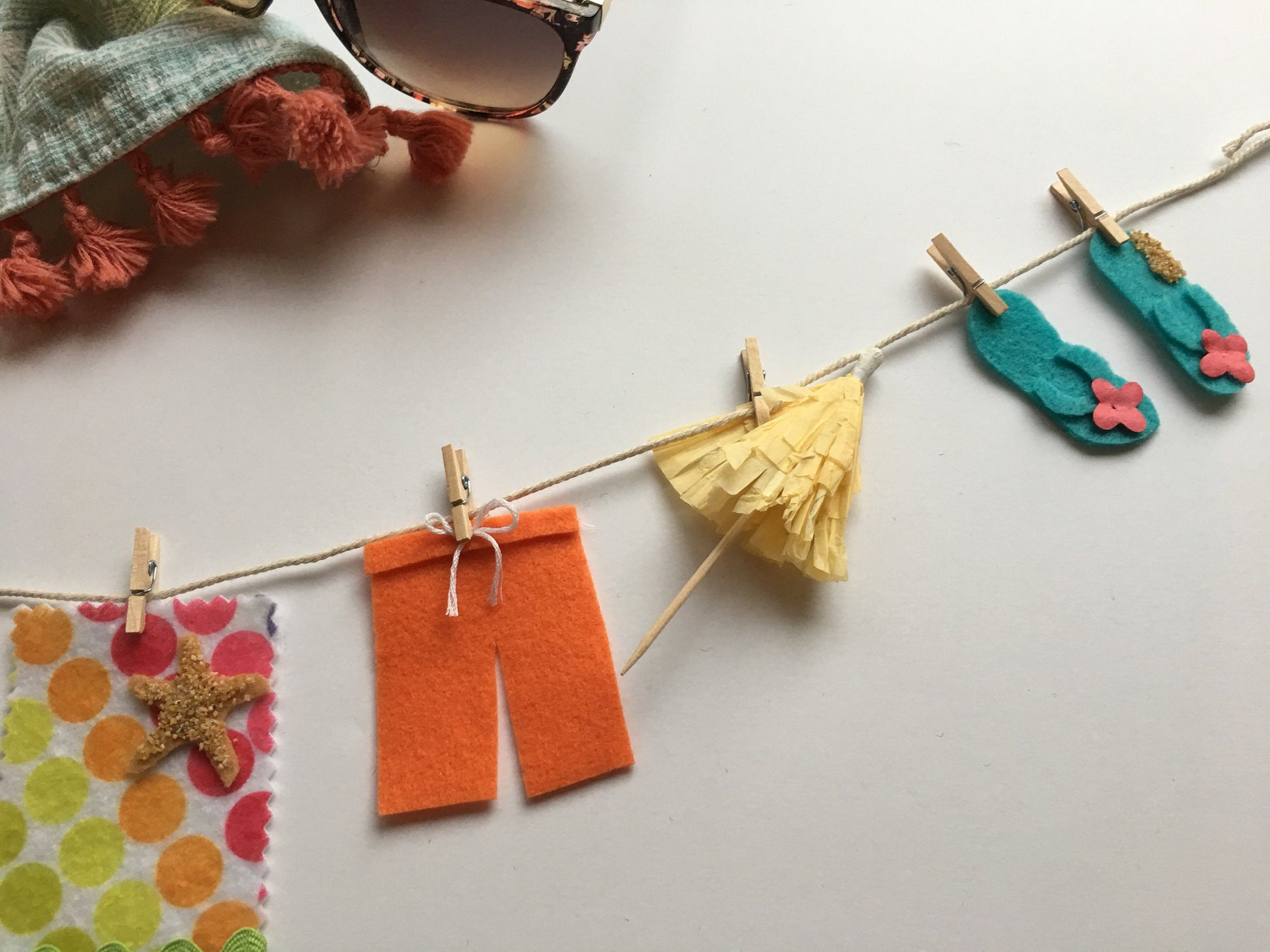 This clothesline garland features a pail and shovel covered in sand, straw sun hat with pink flower, purple bathing suit with sunglasses(color may vary), beach ball covered in sand, towel with rick rack and sandy sea star, swimming trunks, yellow umbrella and sandy teal flip flops with pink flowers.