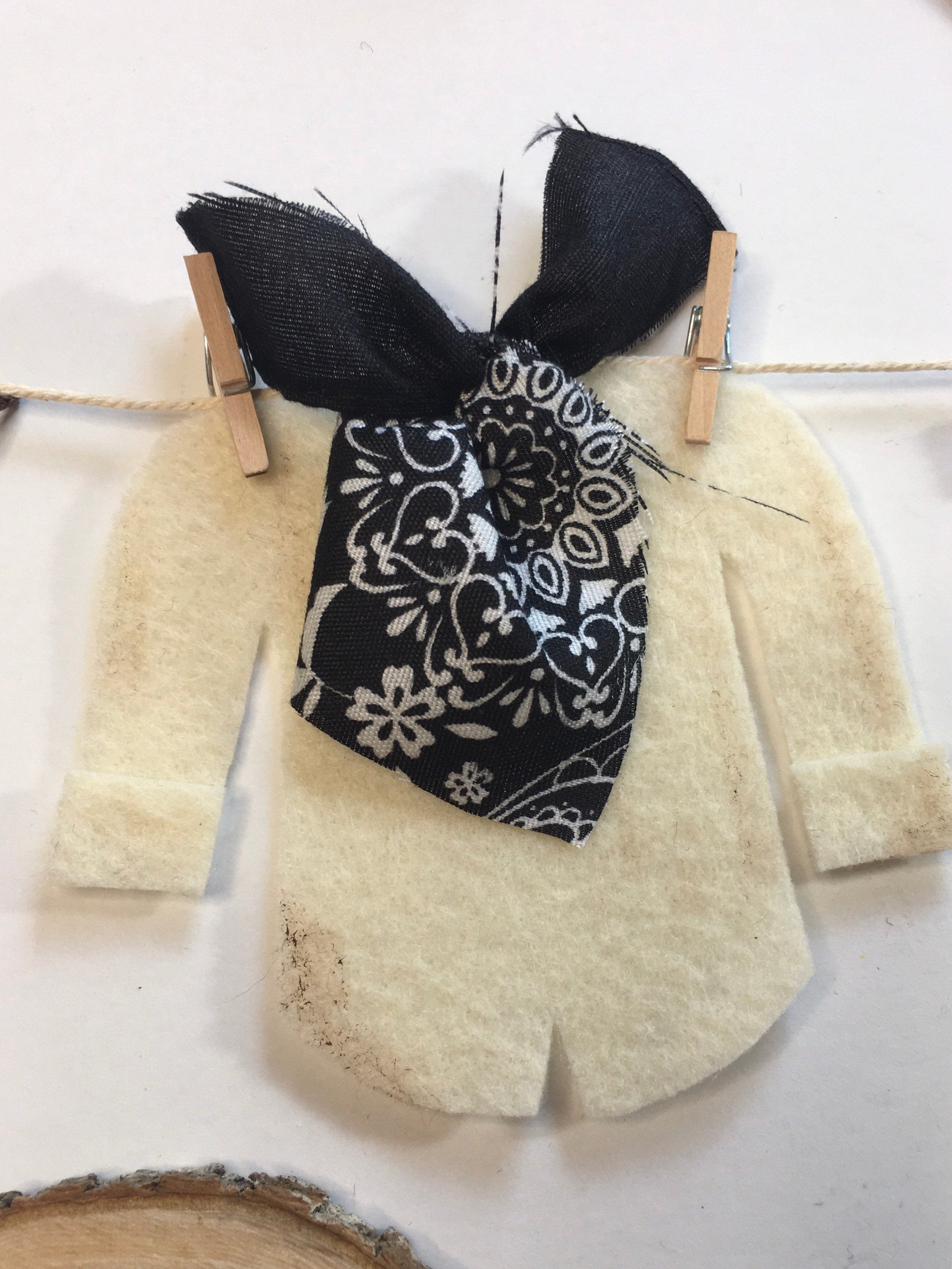 This felt garland features the miniature shirt with bandana*, 3D cowboy hat, cowhide print chaps with gun in holster, hand painted boots with spurs, saddle with lasso, sheriff’s badge with horse shoe detail, hand painted vest with fringe and a pair of dusty socks.