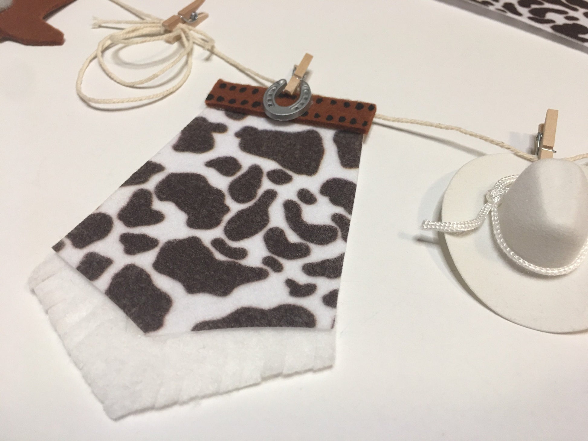 This miniature felt garland features the cowgirl’s outfit hanging up to dry. Her pink gingham shirt has white fringe, her cowhide skirt has a horseshoe belt, her leather vest has cowhide and fringe. Then she hung up her white hat, bandana*, socks, lasso, and cowgirl boots, hand painted to compliment her pink shirt.