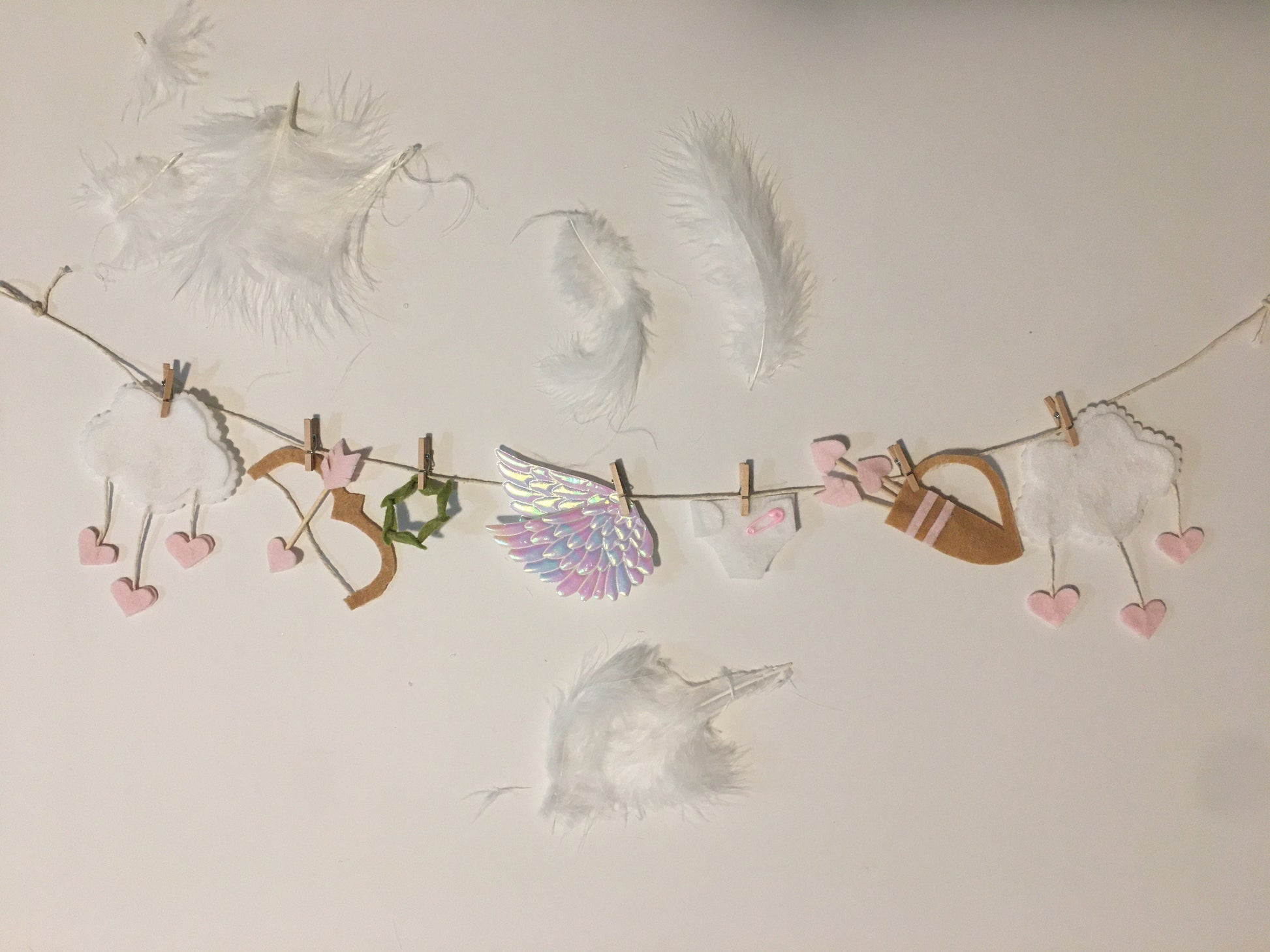 This clothesline features Cupid's bow and quiver full of arrows ready to shoot at two people in love, Cupid's wreath from on top of his head, his diaper complete with pin, and his wings(wings may vary). This clothesline is flanked on either side with clouds that having hearts hanging from them. This light color scheme is modern and a beautiful palette for Valentine's Day decor.