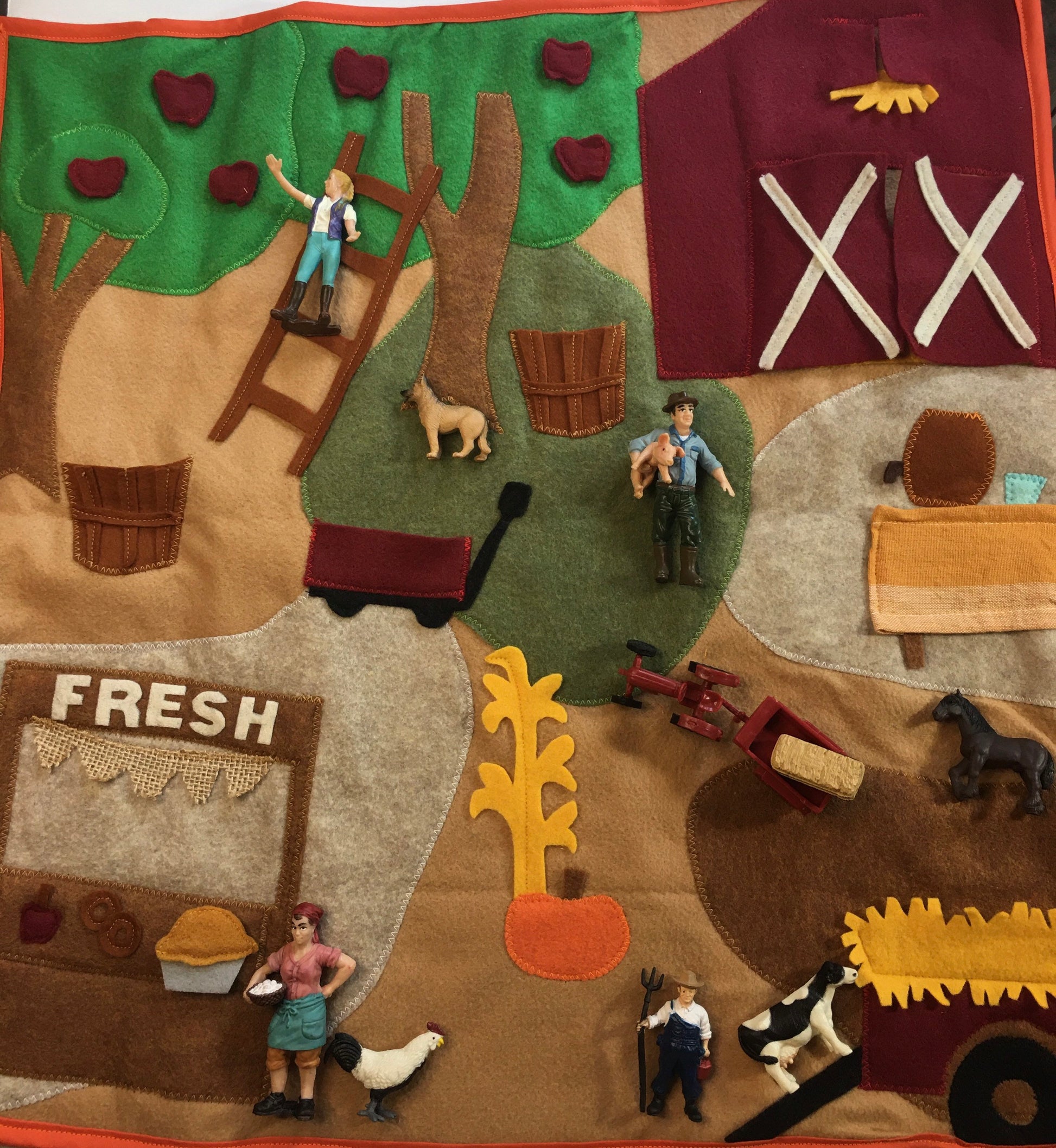 Homemade Heartfelt’s felt playmats fold and then roll up and tie closed for easy carry-along fun. Store in the diaper bag and bring along to waiting rooms, church services or long car rides. Place toys in the center and simply roll them up tightly inside the mat. Includes 11 farm toy figures of farmers, workers, tractor with cart and hay, and various animals. Only available until November 30, 2020.