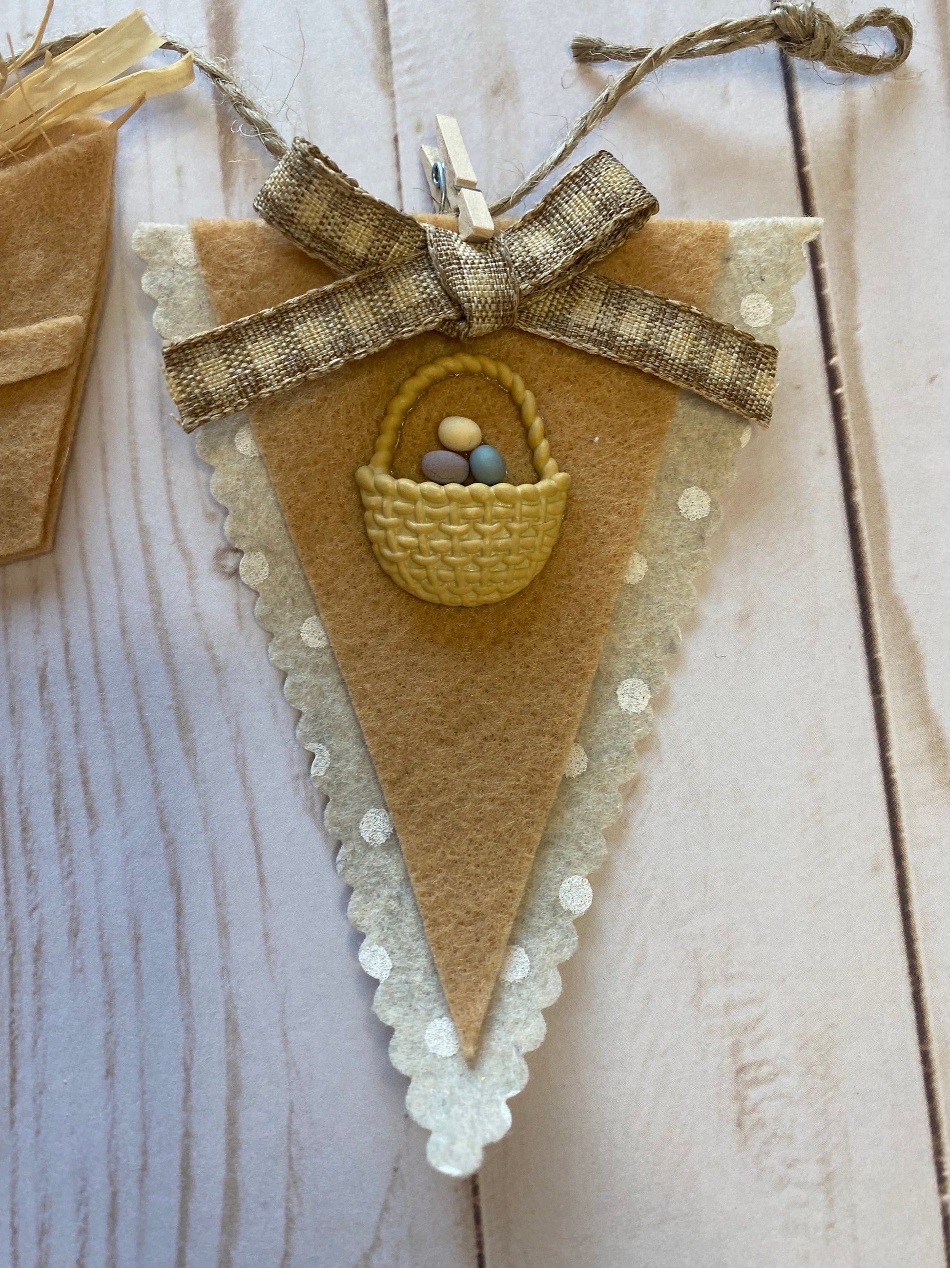 Hang over a doorway, in your entryway, on a magnetic board or bulletin board, off a mantle or shelf. Or simply hang flat on the wall! Easy decorating for all occasions and holidays. Makes a great gift! The barrel is full of neutral colored eggs with a sign saying eggs 5 cents and another barrel with a hen sitting on her nest. The two flag pennants feature baskets with muted multi-colored eggs.