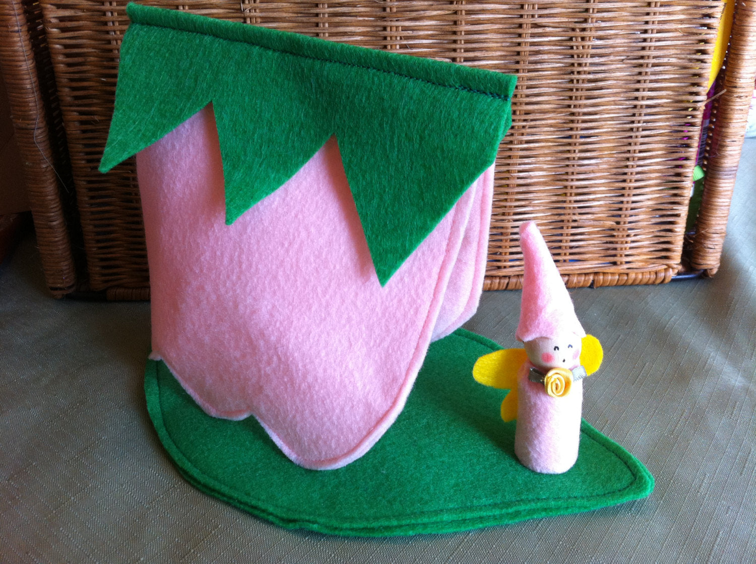 This is a felt fairy peg doll and teepee set. The peg doll has a pink dress with a yellow flower, a pink fairy princess hat, yellow wings, and pink cheeks! She lives in her pink flower teepee with a comfy leaf floor. Lays flat for storage.