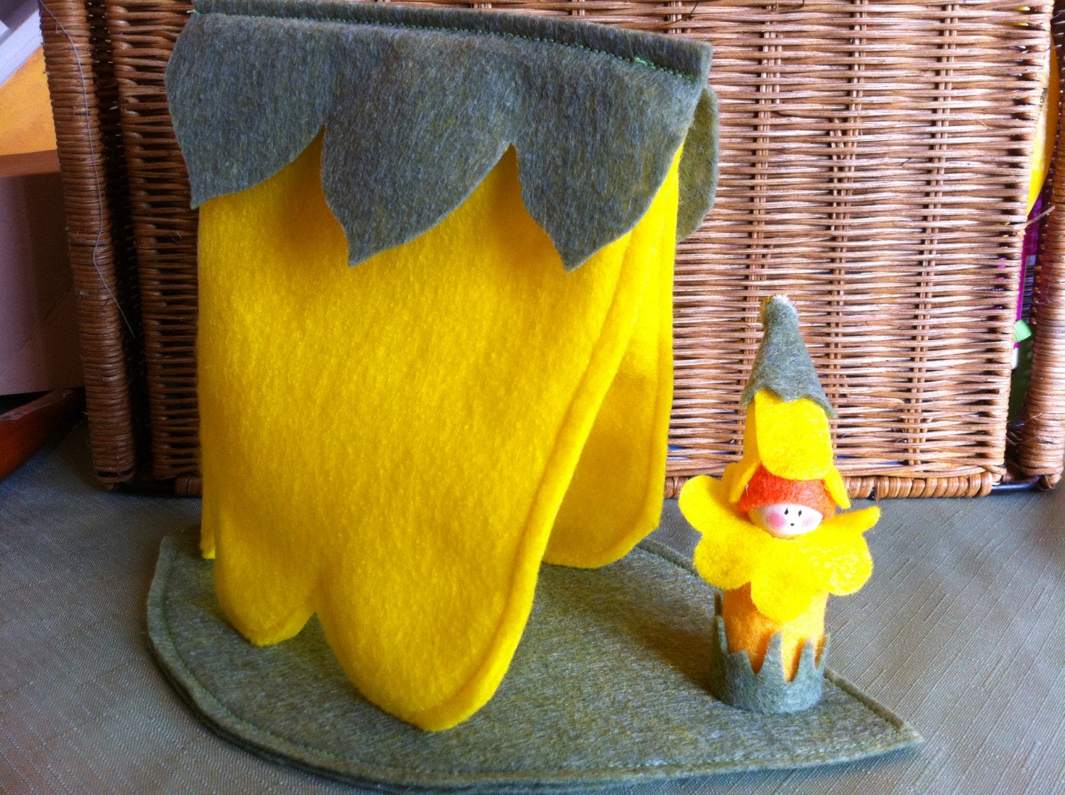 This is a felt fairy peg doll and teepee set. The peg doll has a orange dress with grass detail at the bottom and yellow shoulder smock. Her hat looks like a flower with a sparkly pompom at the top and she has pink cheeks! She lives in her yellow flower teepee with a comfy leaf floor. Lays flat for storage.