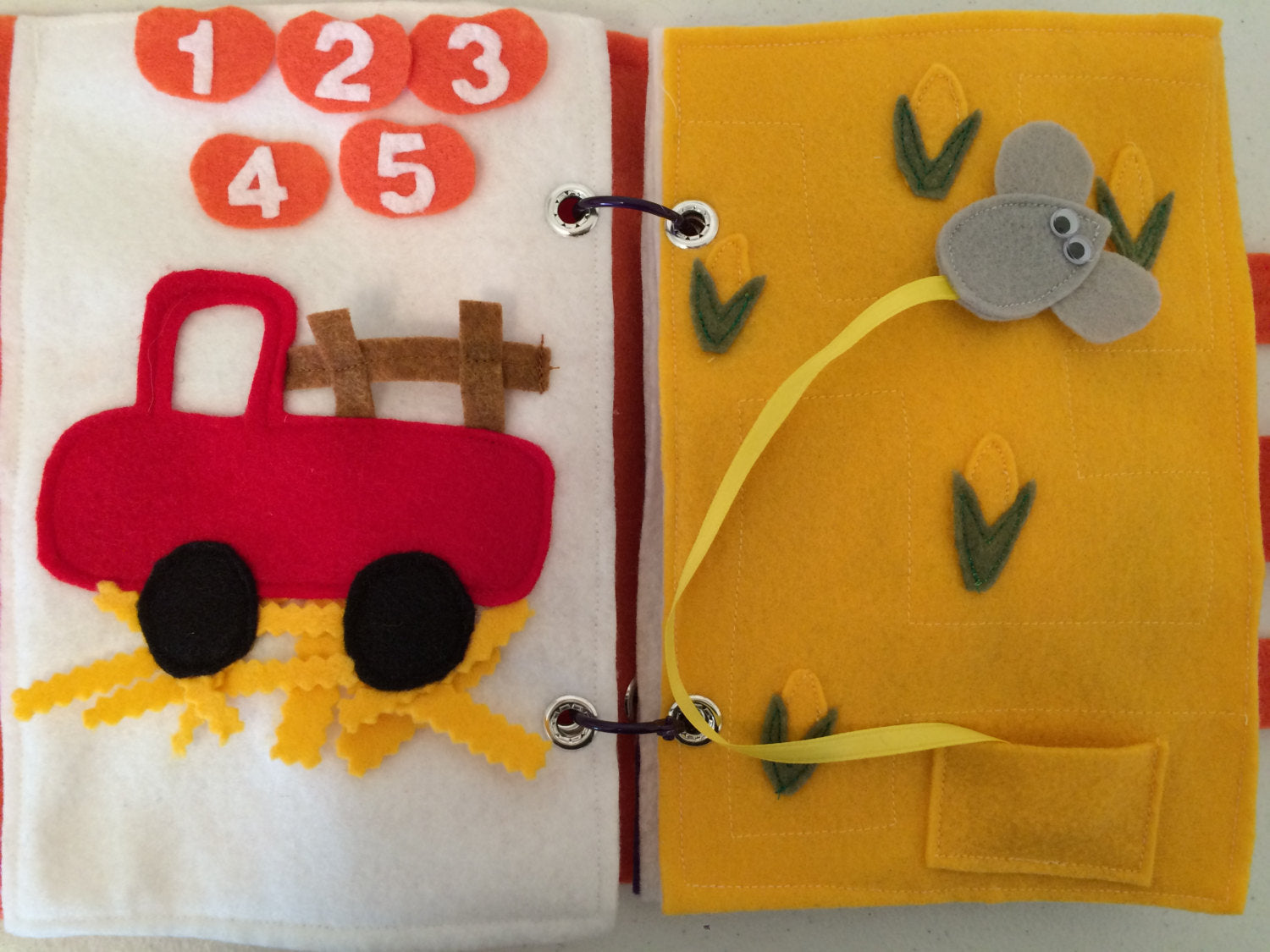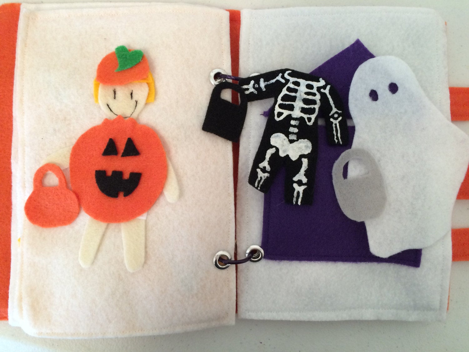 This is a miniature felt quiet book in the Halloween theme for children aged 3-7. Possibly age 2 with close adult supervision as it does contain small pieces.