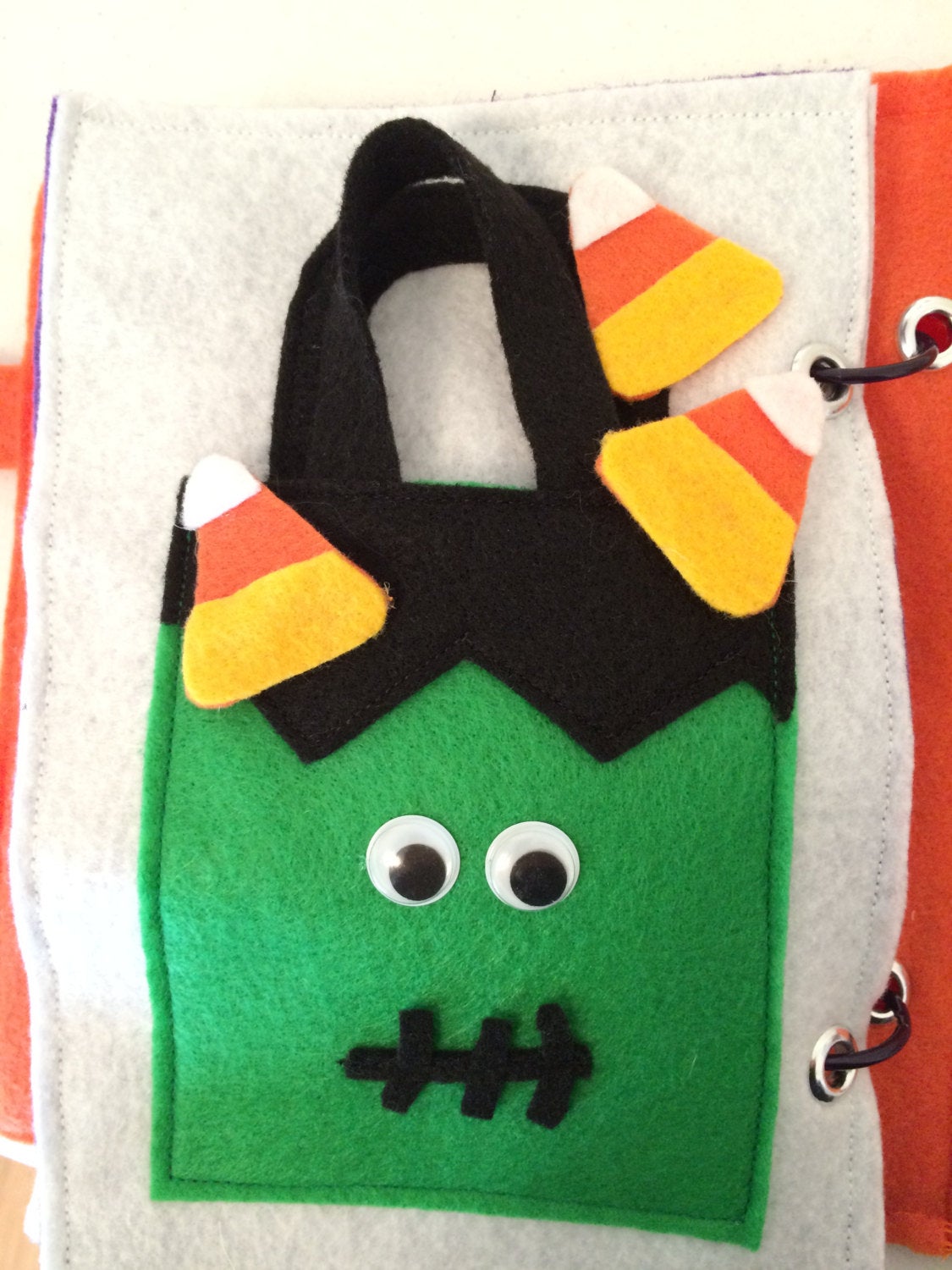 Page 8: A Frankenstein trick-or-treat bag that opens and holds 3 pieces of candy corn.