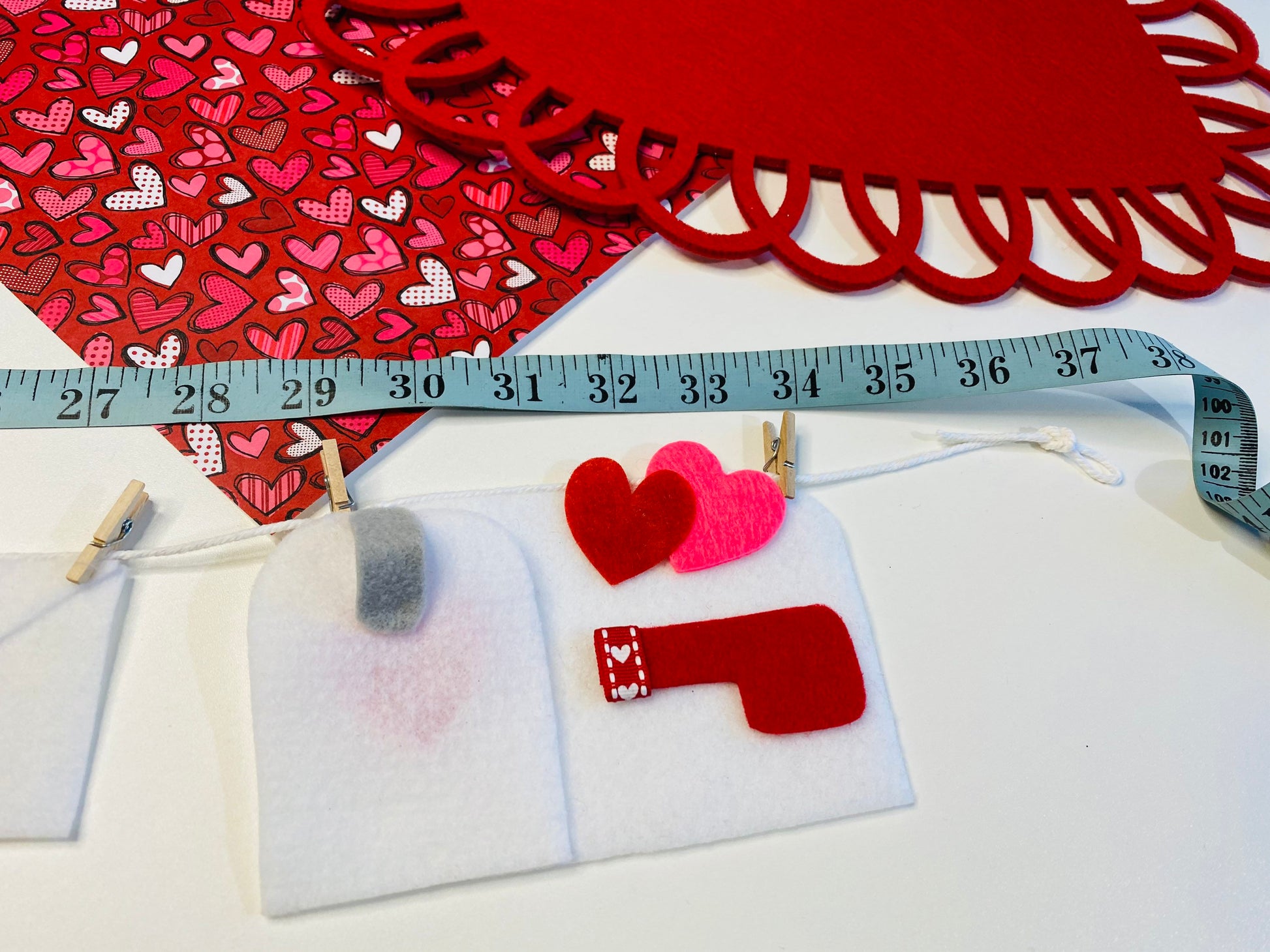 This miniature felt banner features a teddy bear holding heart-shaped balloons, envelopes and mailboxes. The perfect Valentine’s Day banner for your fireplace mantel.