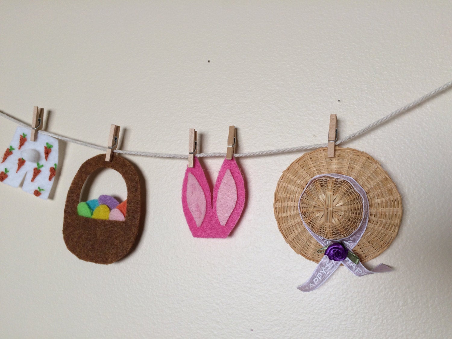 Hang up this whimsical miniature Easter felt clothesline this spring and it's sure to bring a smile to all who see it. Children ages 2-100 will love the bunny's tail on his carrot boxers hung on the line. This miniature felt clothesline also features a straw Easter Bonnet with ribbon that says Happy Easter on it.