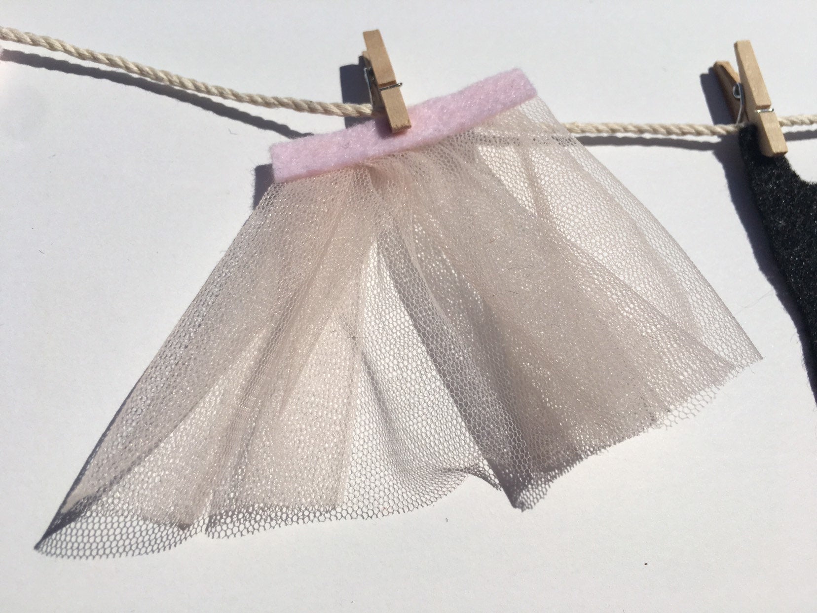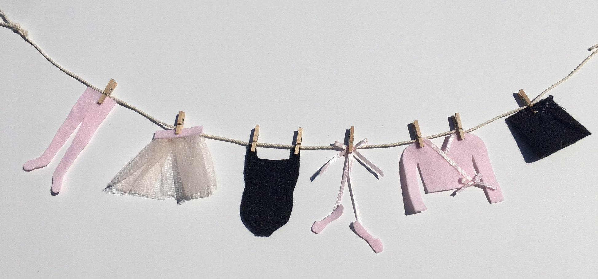 This clothesline features the black leotard, pink tights, dusty rose pink tutu, the light pink wrap around warm up sweater, the black skirt and the beloved hanging pointe shoes. Everyone is sure to love the darling ballet slippers hanging from the clothesline.