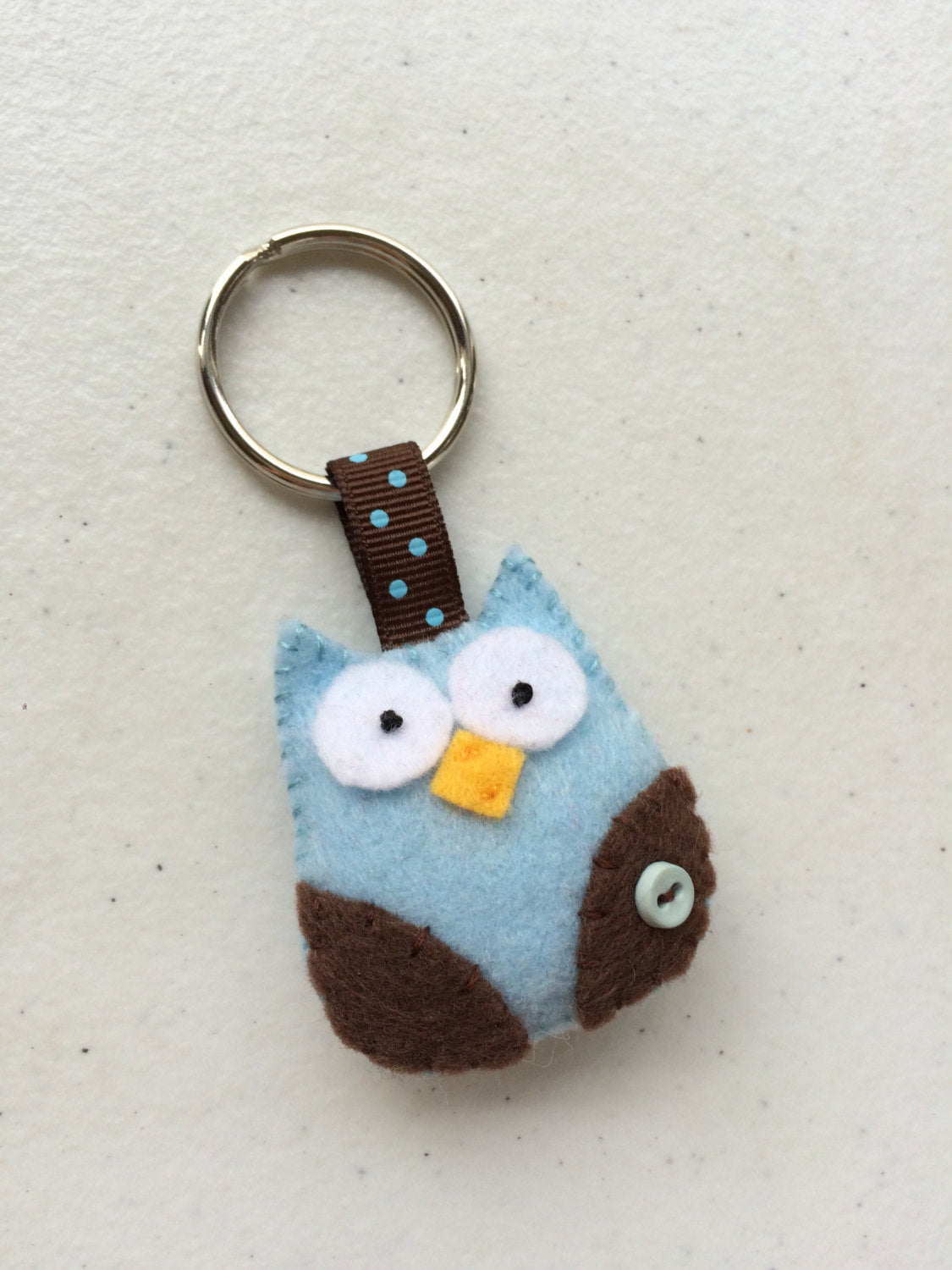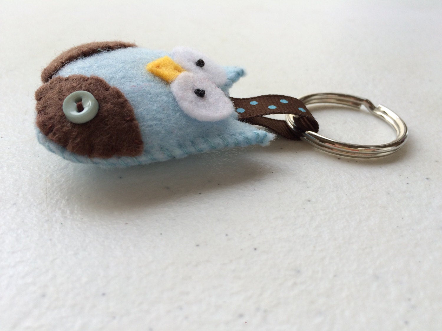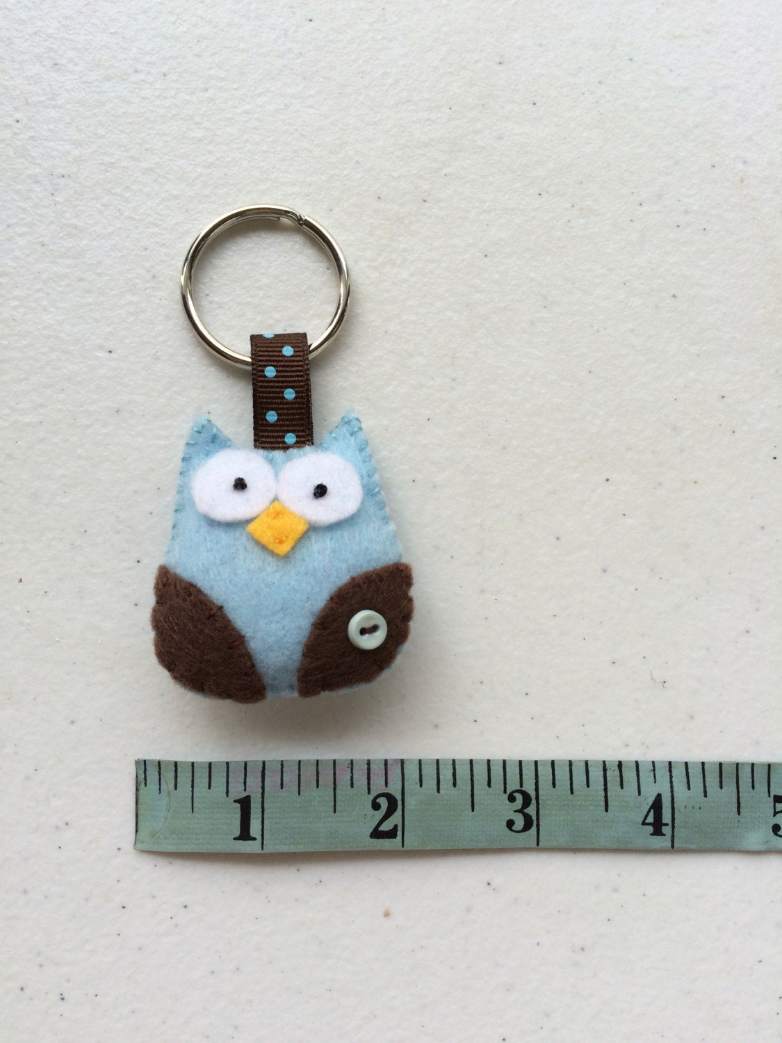 This is a darling little blue and brown owl keychain made of felt. It is hand sewn with a miniature blue button detail. About 2 inches wide and 3 inches tall(smaller than some of my other key chains).