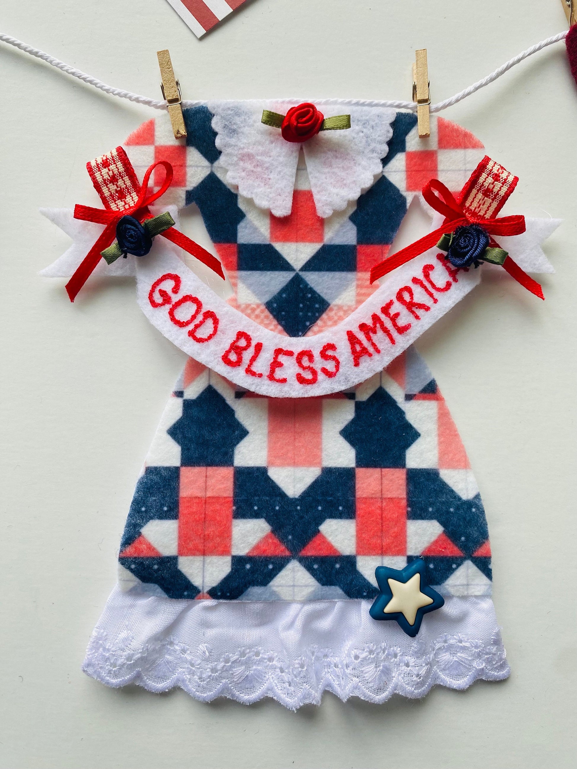 Patriotic God Bless America Banner, Miniature Felt Americana Dress Clothesline Bunting, Liberty Bell Garland, Wall Hanging Decor for July 4