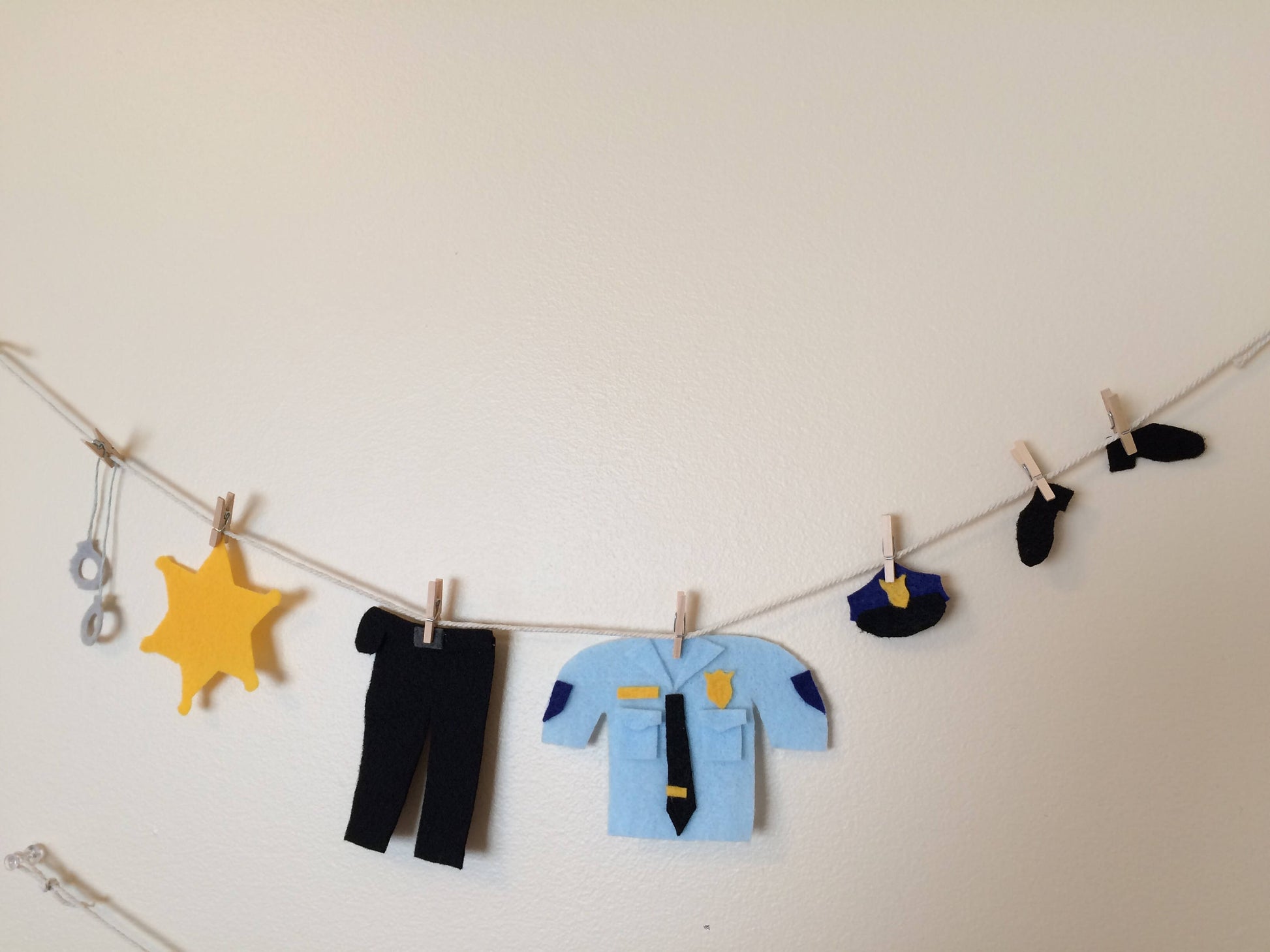 This is a miniature felt clothesline of a policeman or woman uniform. It features the police uniform shirt, tie, and badge with pants and belt with gun holder. It also has the hat and shoes as well as handcuffs and a Sheriff's badge.
