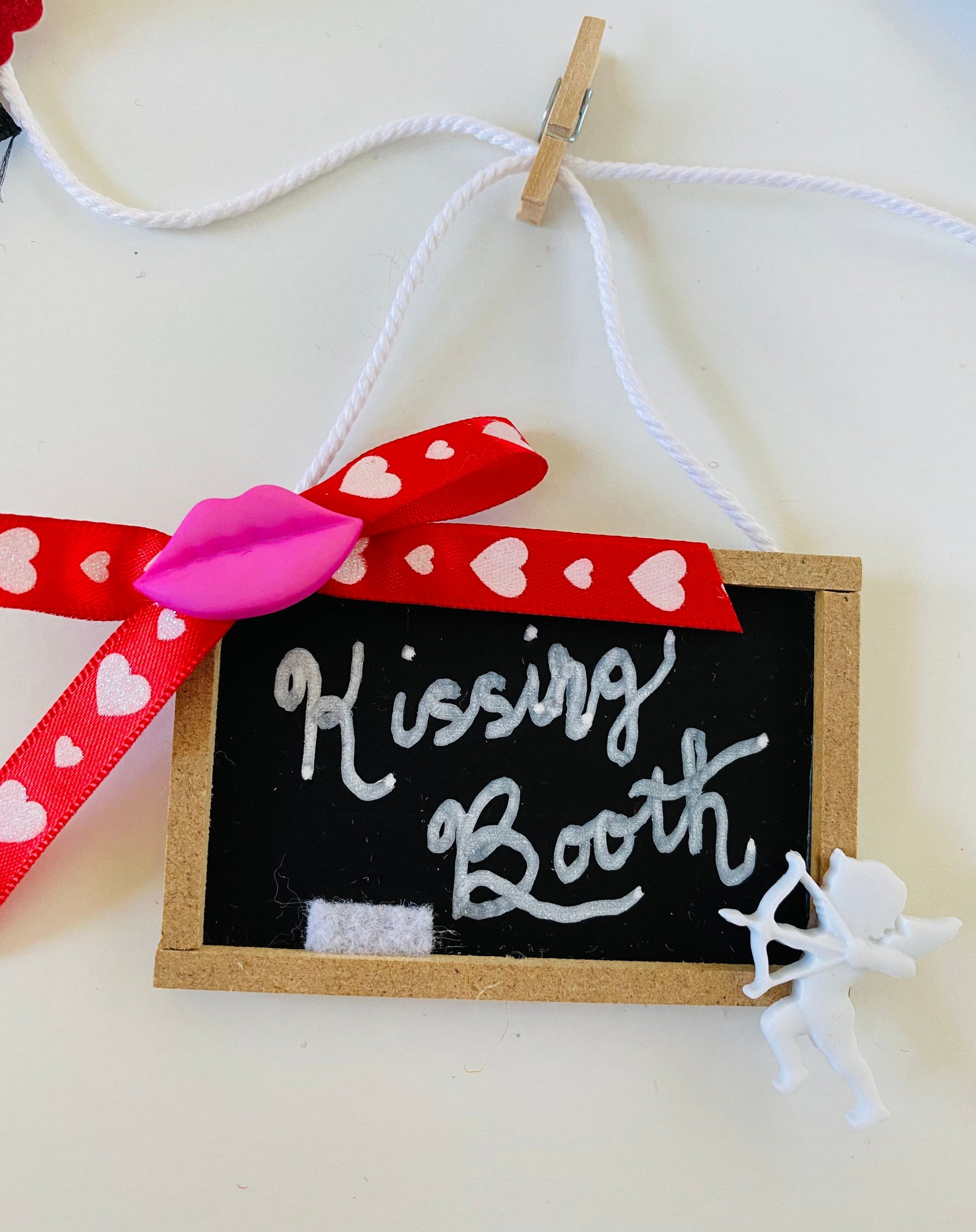 This garland features the kissing booth with decorative awning made of various printed felts, the heart shaped balloons and the jar full of X's and O's. There is a miniature chalkboard advertising the kissing booth and a ticket of course. On either side hangs a flag pennant with the doggy himself and puppy print bows(don't worry, there will be two bows, I just ran out for this photo).