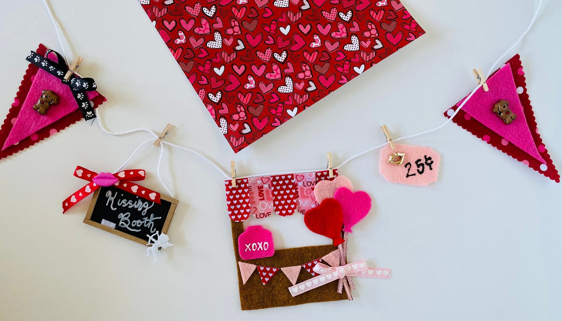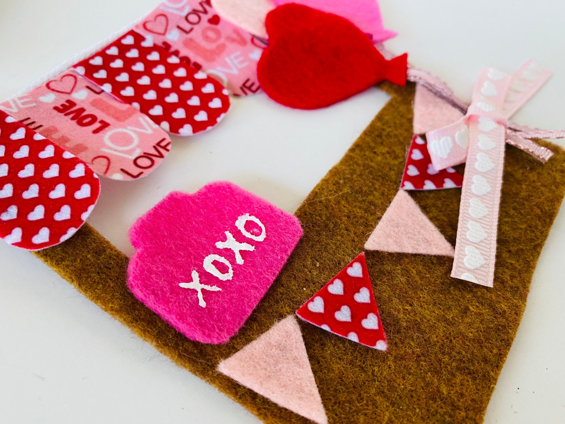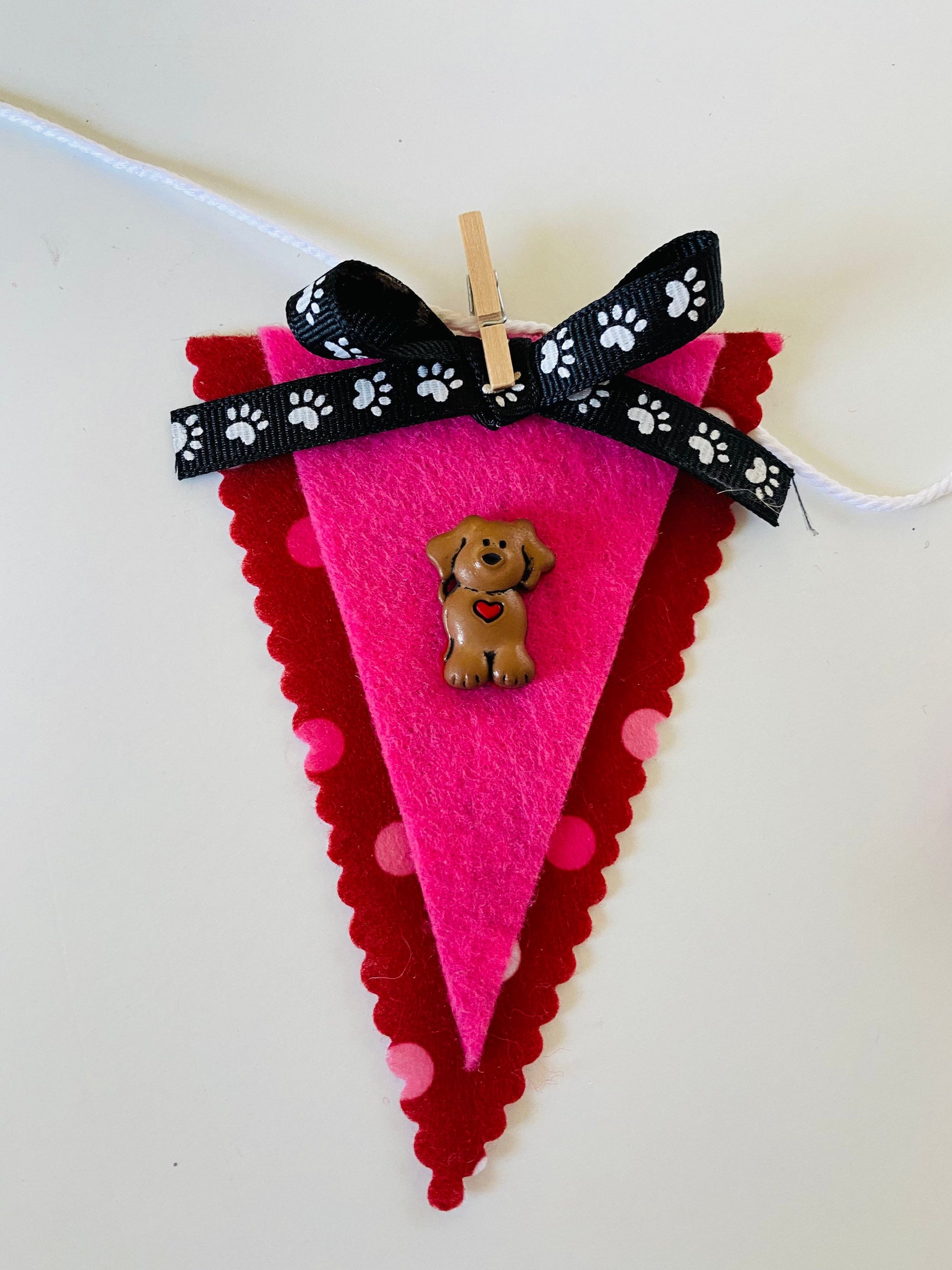 The idea of a kissing booth with puppies would bring everybody out to celebrate Valentine's Day! Bring some whimsical joy to your home decor when you hang this miniature felt banner this holiday.