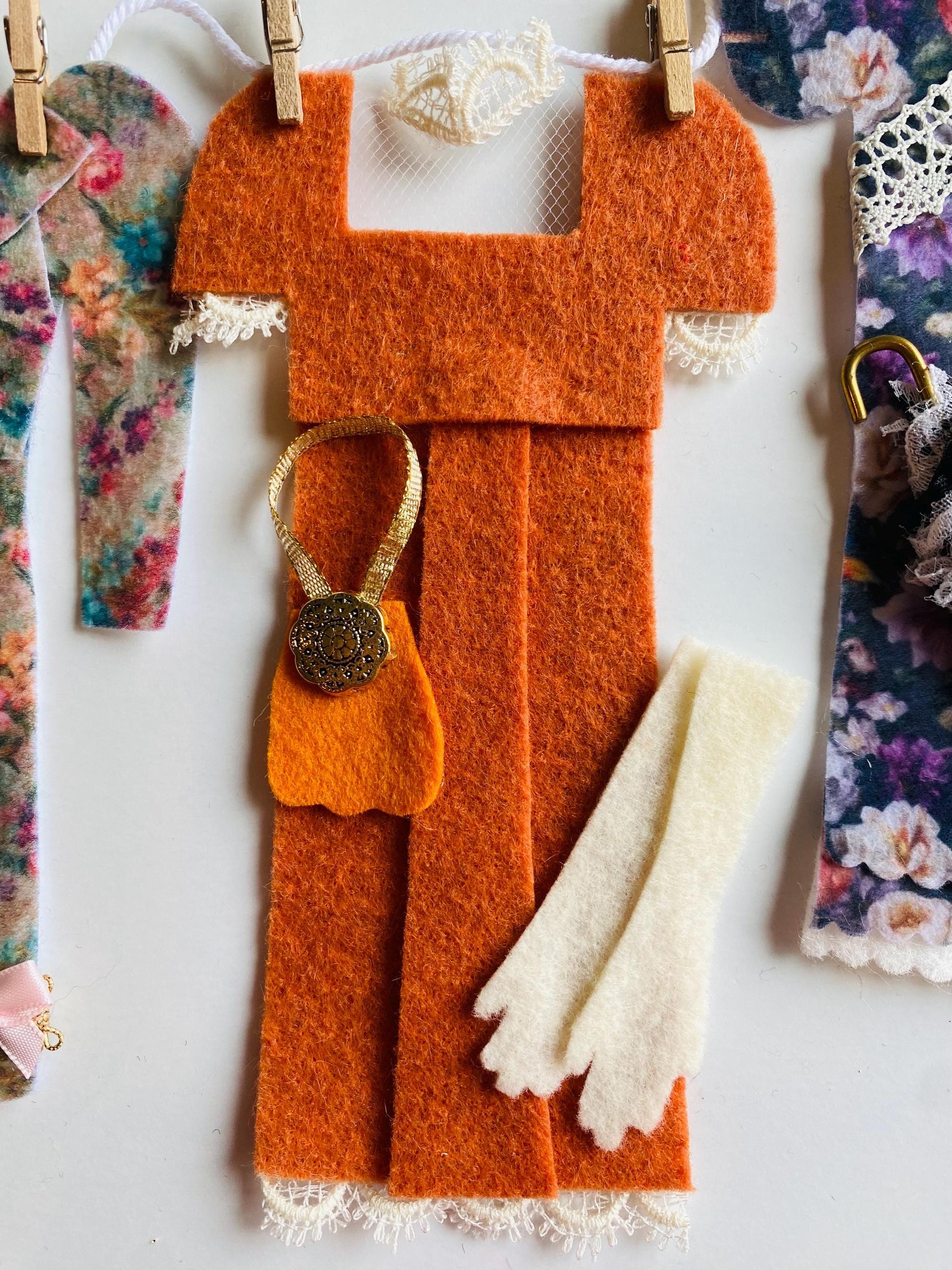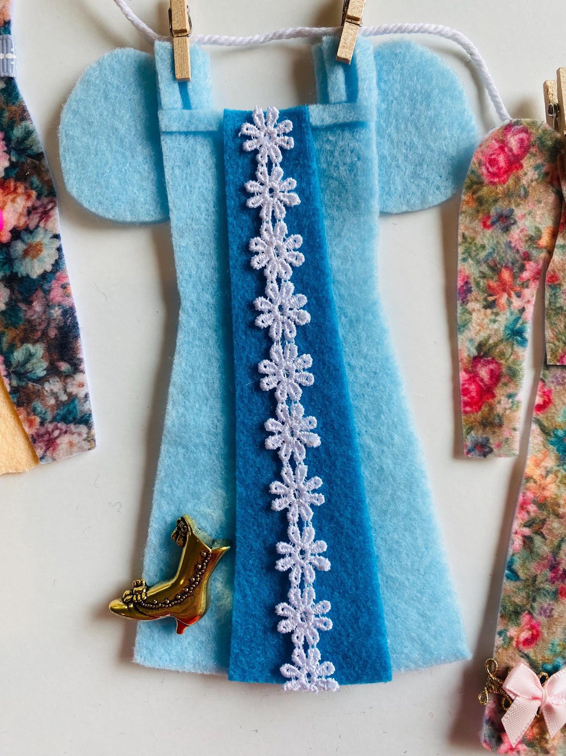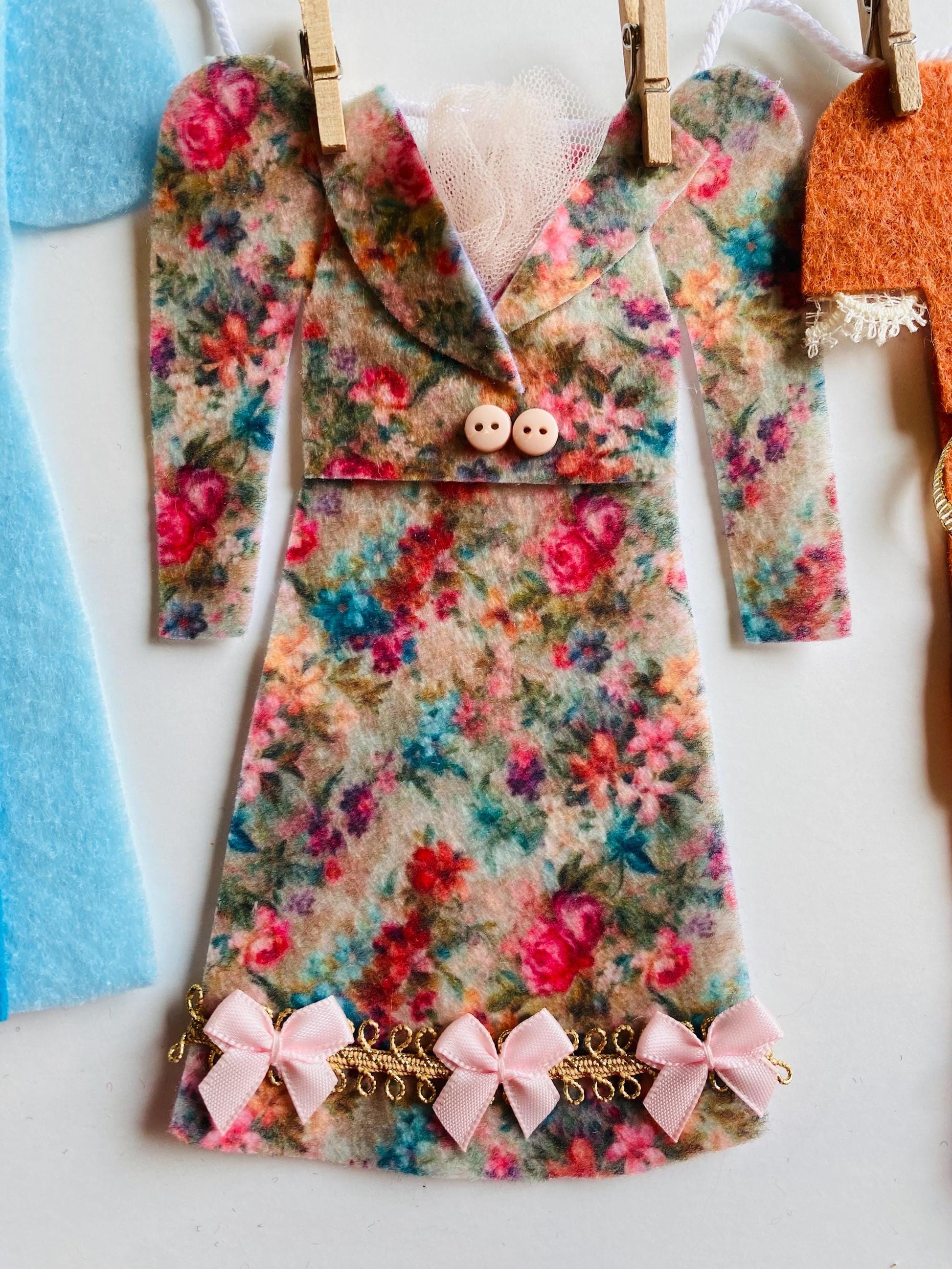 Oh to be alive during the Regency Era of the early 1800s and don one of these beautiful pieces of women’s fashion! Alas, we can just gaze upon these miniature dresses hanging on the clothesline banner and dream away. This miniature felt garland would be the perfect addition to a themed party, a tea house’s decor, or a gift for a lady.