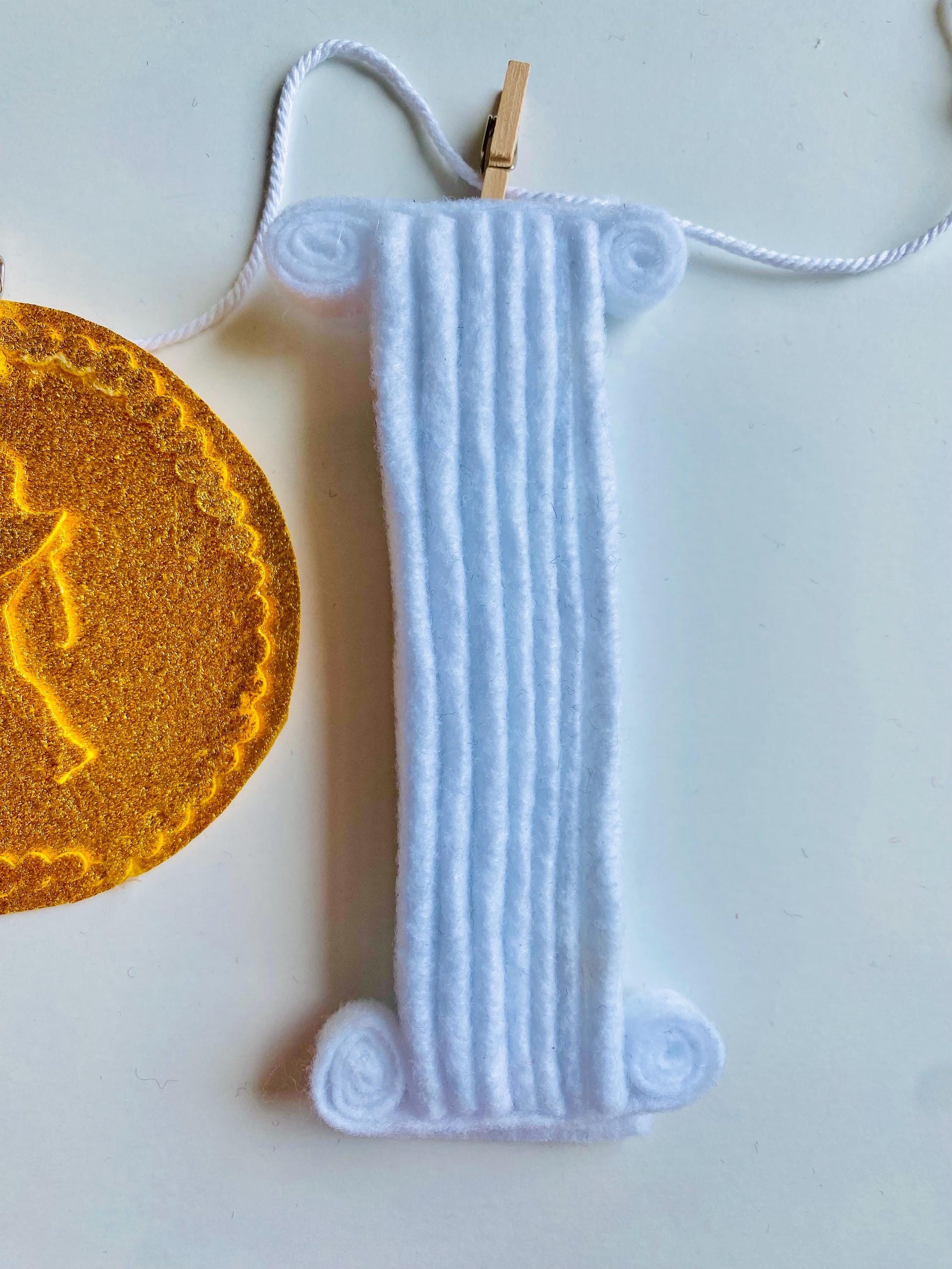 This unique Greek and Roman felt banner is perfect for your themed party or classroom! I hand paint the redware vase with Pegasus and I fold the felt and glue it for the toga. The Doric columns are just iconic and the gold coin with the Olympian on it will add the perfect historical theme to your party or classroom.