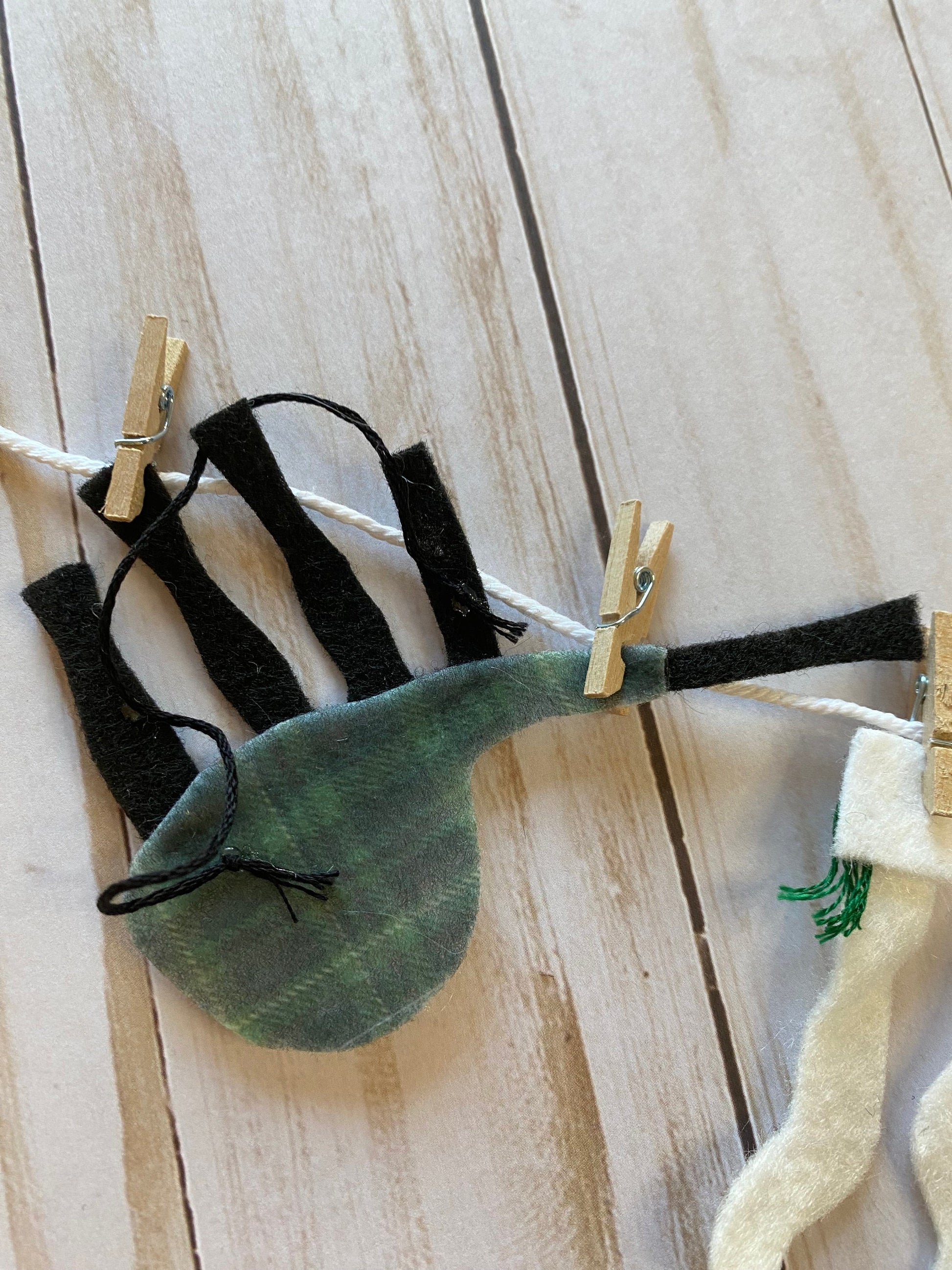 Scottish Bagpiper’s Clothesline Banner, Irish Kilt Miniature Felt Garland, Wall Hanging Decoration for St. Patrick’s Day