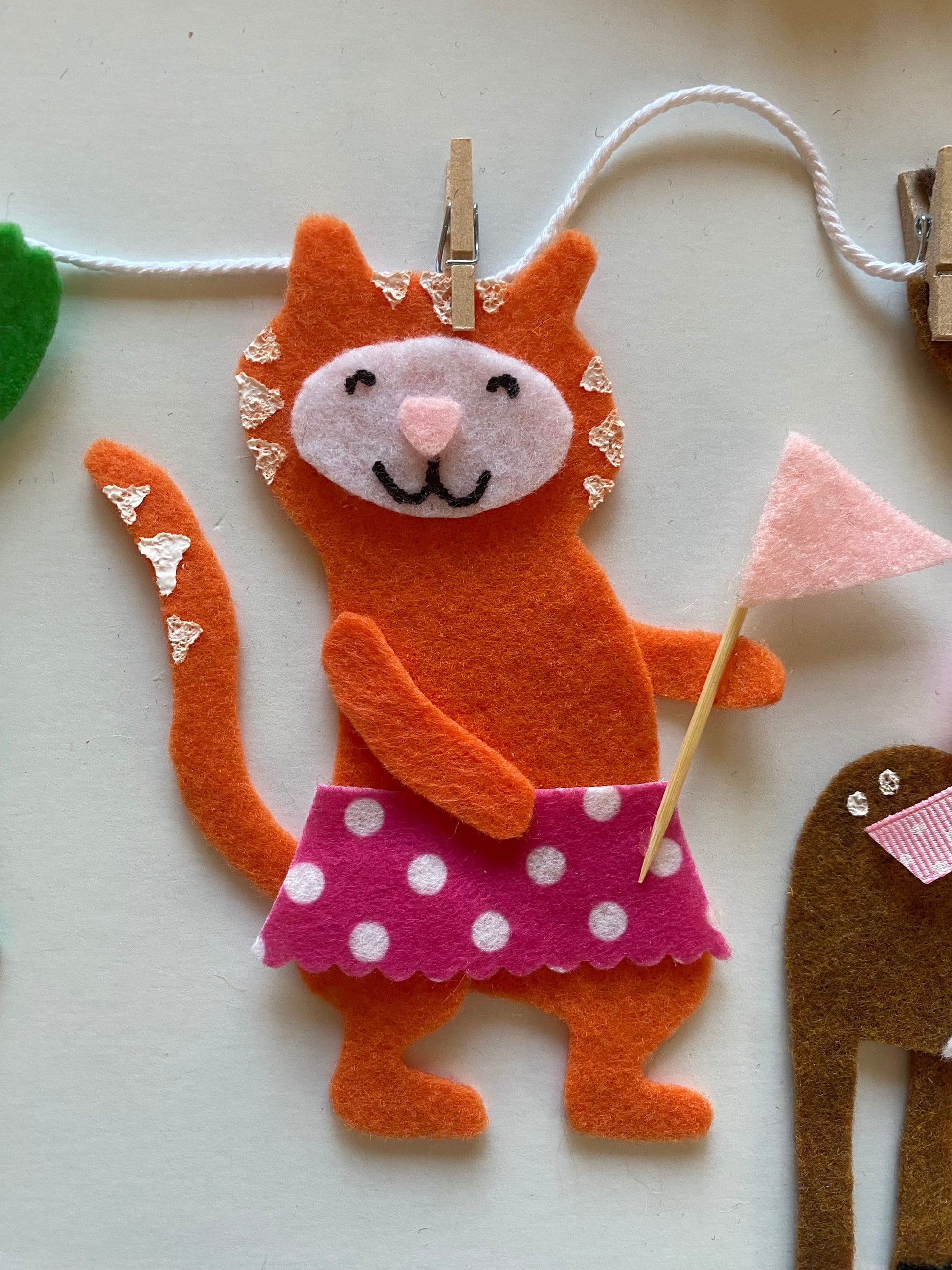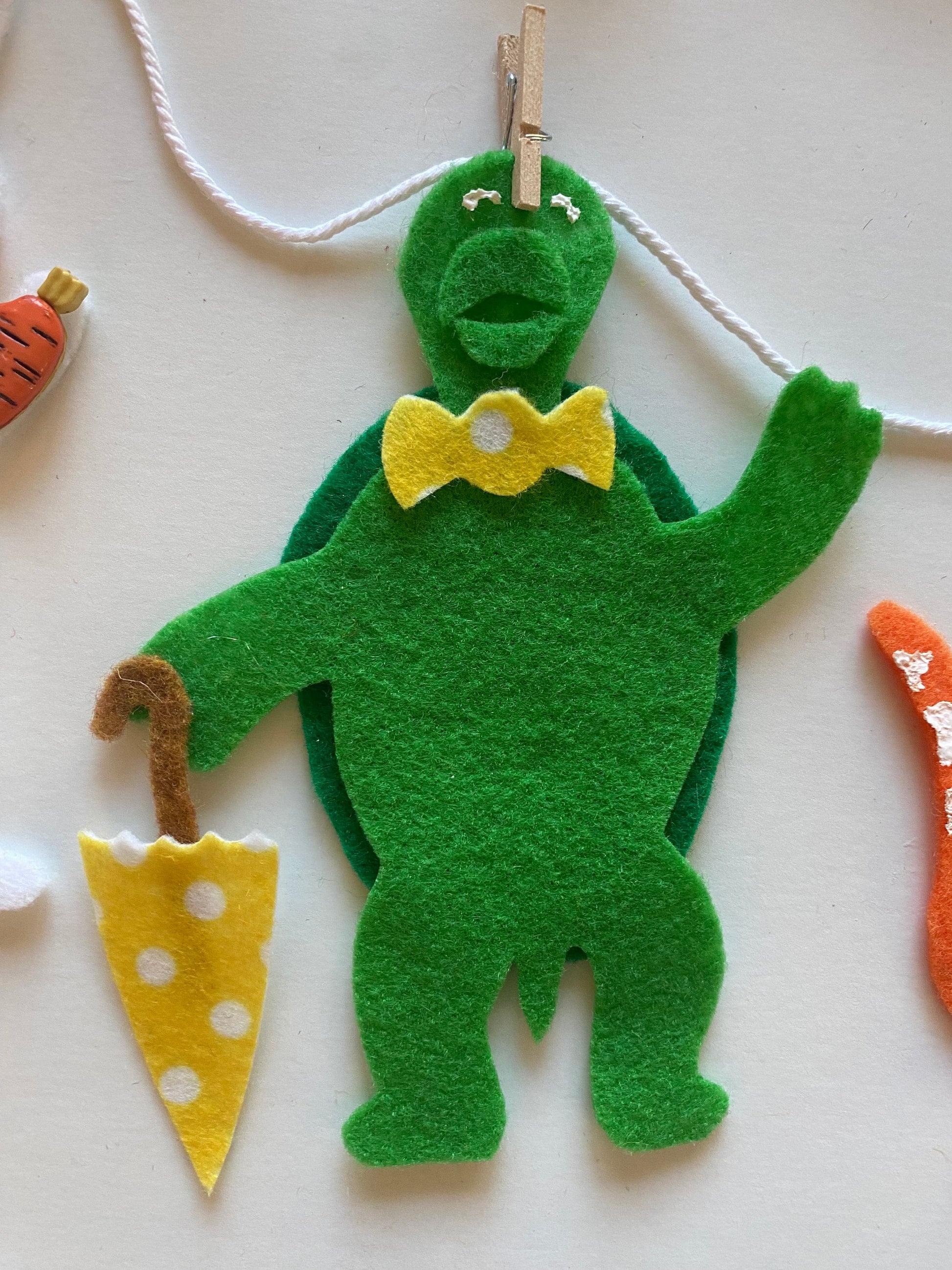 This miniature felt clothesline banner features a rabbit, turtle, cat, fawn, lamb, hedgehog, and duck. Some are wearing spring skirts and bows, bugs are all around them or on them, and they are just embracing the change of the season. This adorable banner would be a wonderful gift to welcome a spring baby or to decorate for a spring baby shower. Perfect for a spring display at school or in the home too.