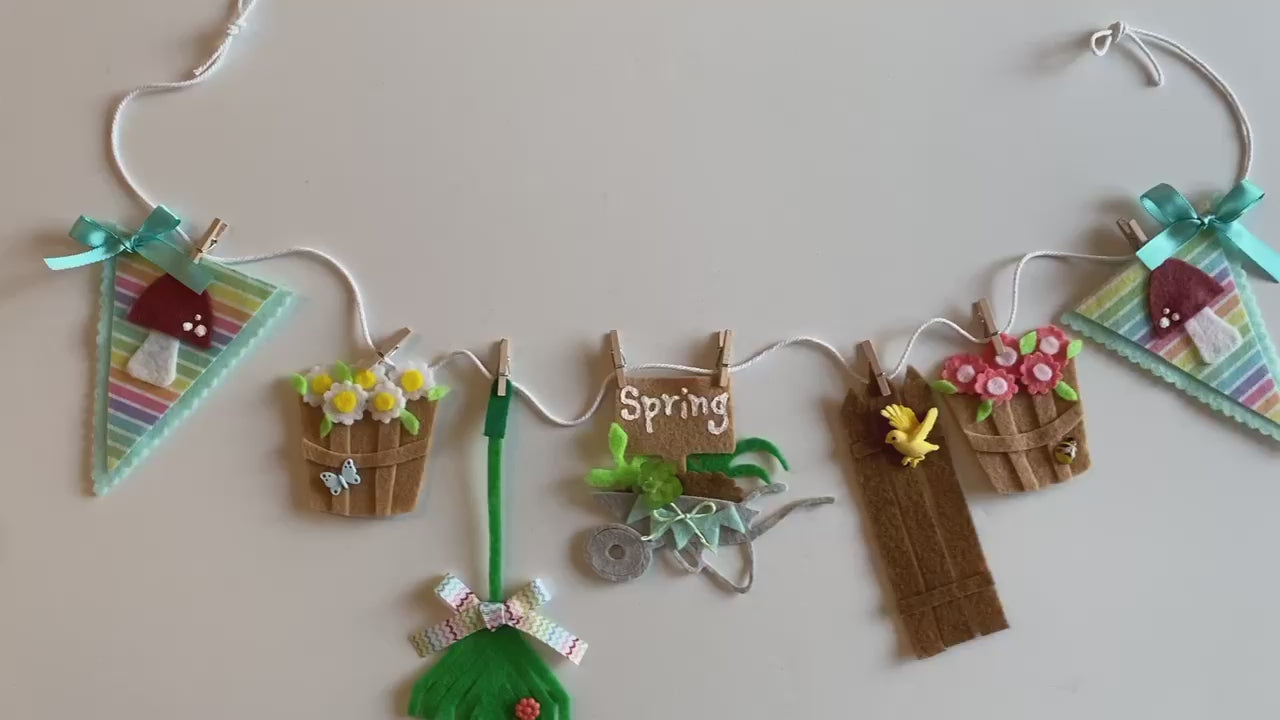 This banner is perfect to decorate with in the month of May, when spring is really awakening outside. This miniature felt garland features a wheelbarrow filled with dirt, some plants, a sign that reads "spring," and a 3D succulent. A teeny tiny flag bunting is strung across the front with a bow made from light green striped baker's twine. There is a piece of a picket fence with a yellow bird, a green rake with a bow and flower on it, and two barrels filled with flowers along with butterfly and bee buttons. The garland is flanked on either side with pastel rainbow striped pennants with little mushroom toadstools on each, bordered in scalloped teal felt with a teal satin bow.
