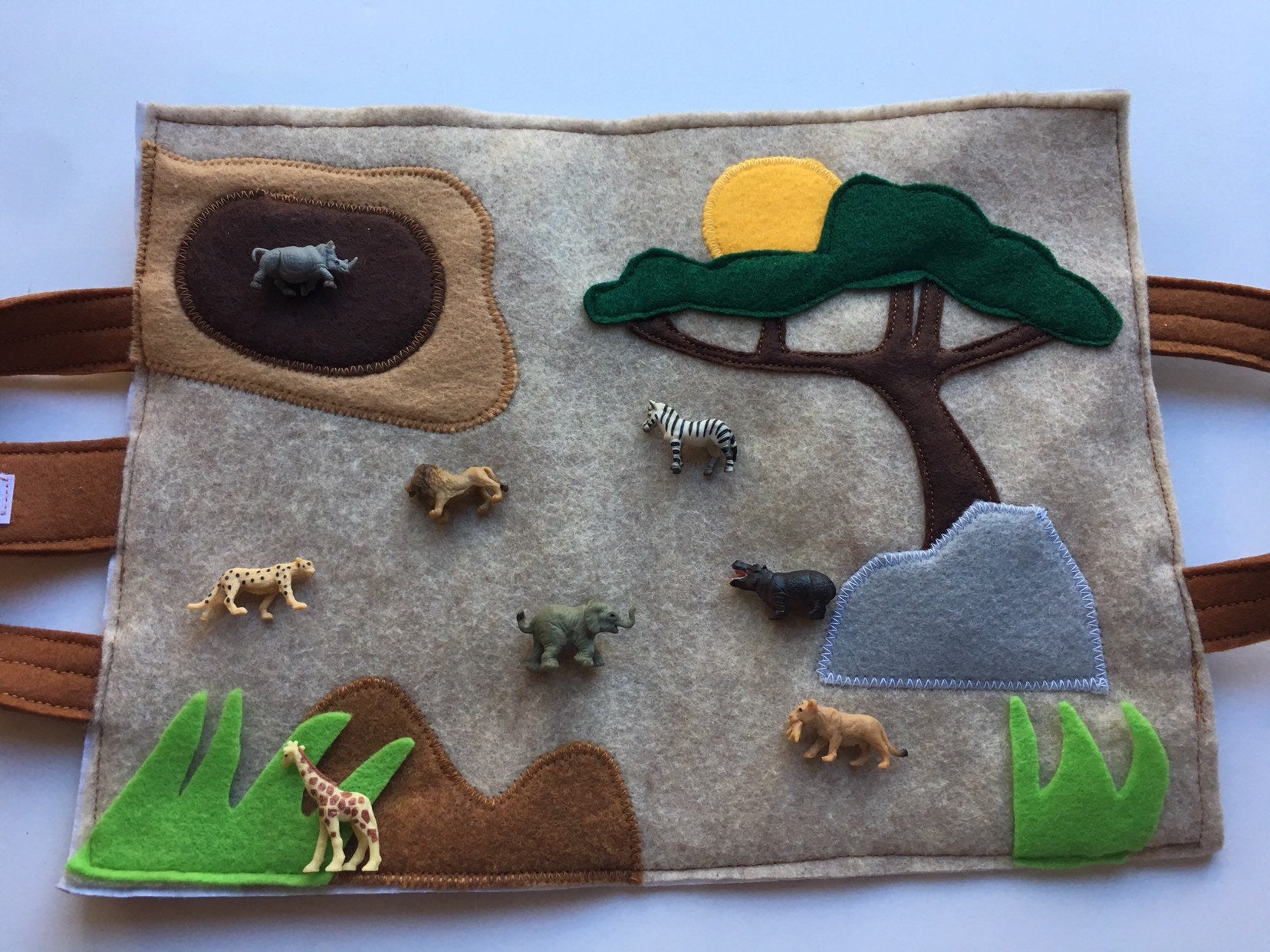 This is a miniature version of my full-size safari playmat in my shop. It’s perfect for traveling in the car, waiting in an office, or for quiet play during church services.