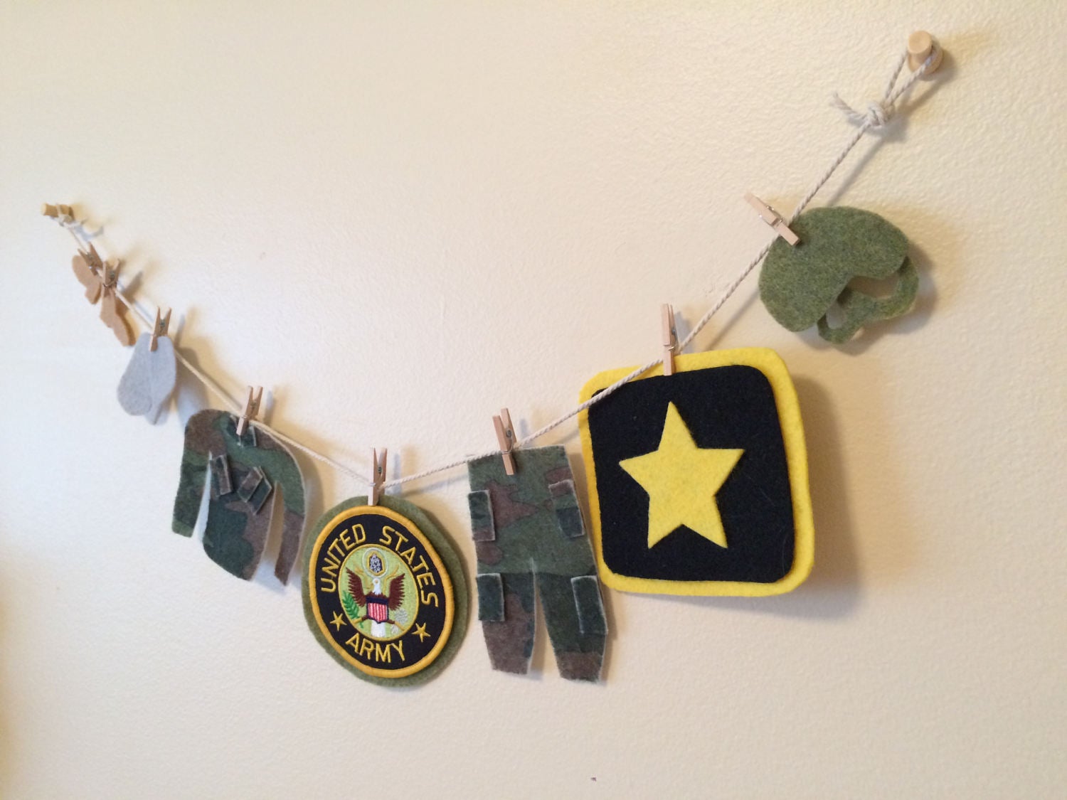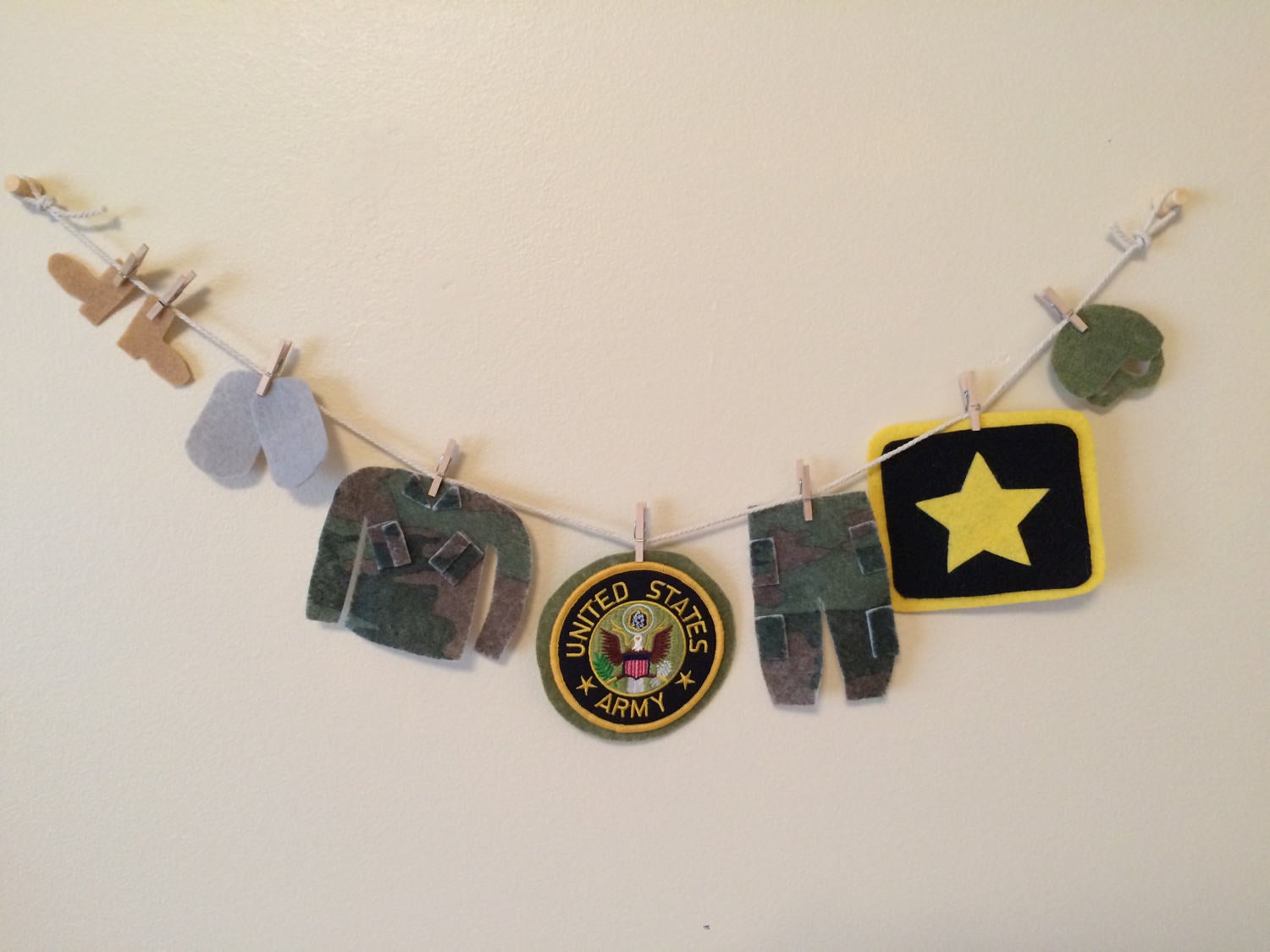 This is a miniature felt clothesline of the United States Army uniform. What a great addition to any Army home, honoring your serviceman or woman. This felt clothesline features the soldier's camouflage uniform, combat helmet, boots, dog tags, and the Army star logo. The patch is machine embroidered.