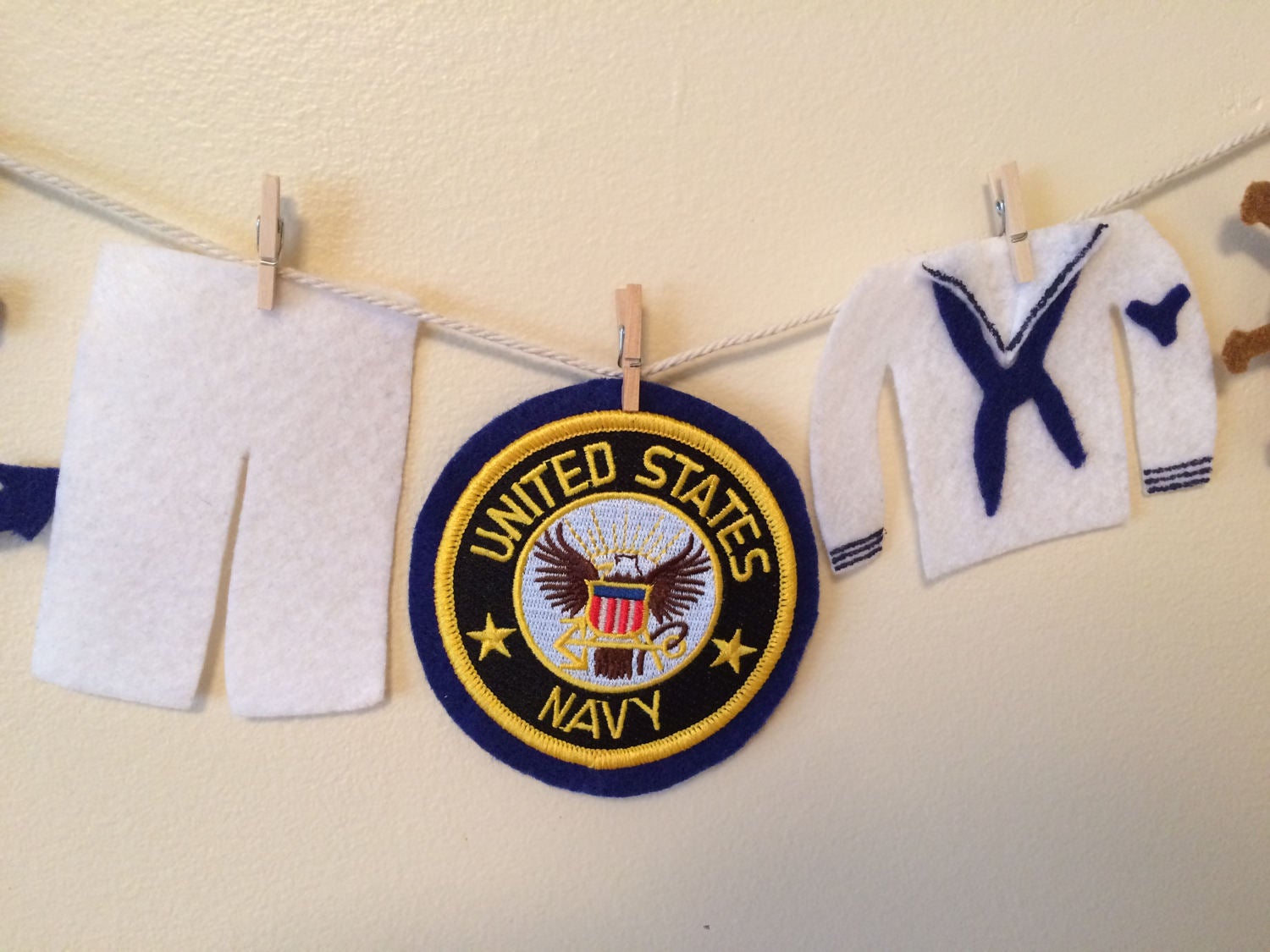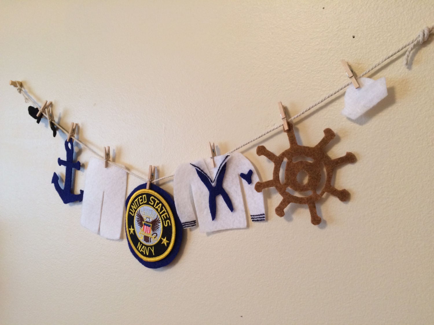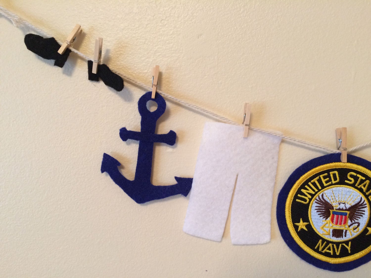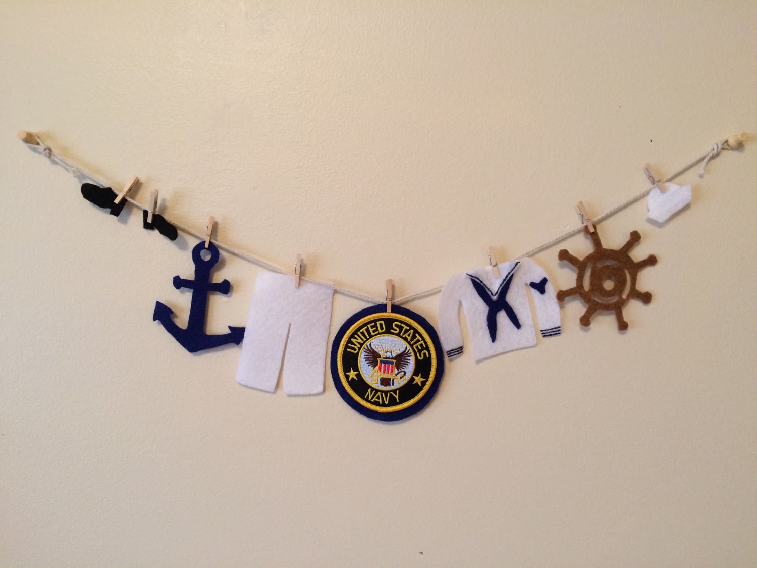 This is a miniature felt clothesline of the United States Navy uniform. What a great addition to any Navy home, honoring your serviceman or woman. This felt clothesline features the sailor uniform, hat, shoes, anchor, ship's wheel, and Navy patch. The patch is machine embroidered.
